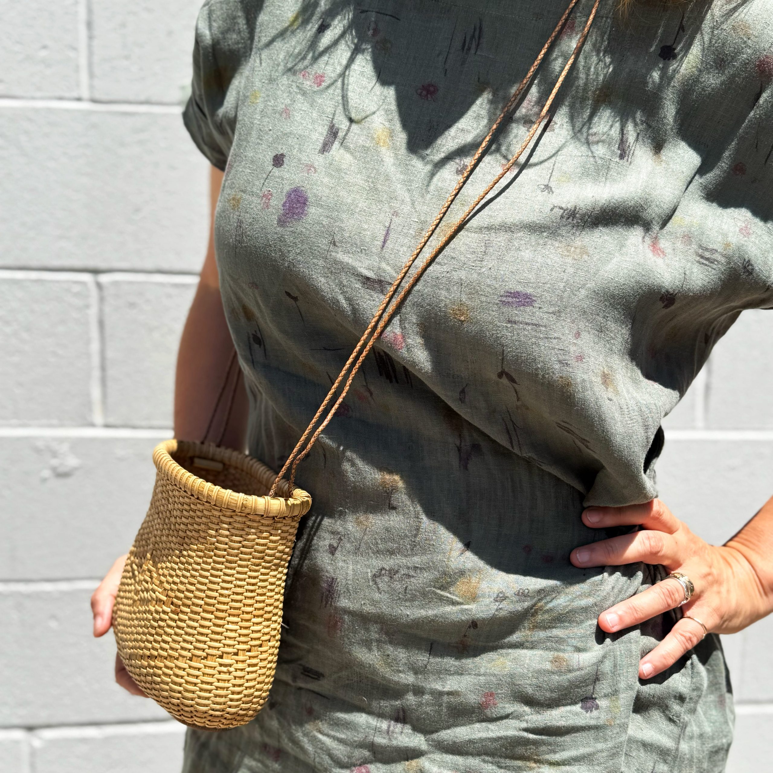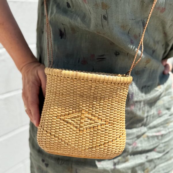 One of a kind and handwoven. Natural fibers, natural dyes, faux bamboo handles.
